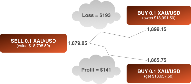 When you go short on XAU/USD, you’re theoretically selling gold for dollars. To close the position, another trade in the opposite direction is used to offset it. Your profit or loss will be calculated in dollars. If the price of gold decreases, you profit and are left with more dollars when you close the position. If gold strengthened, you’d get back fewer dollars.