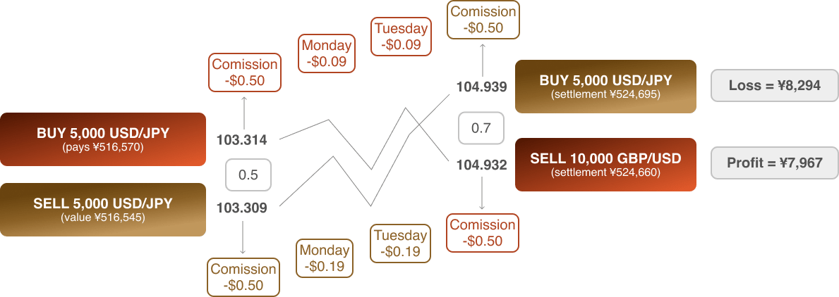 A swap is a fee for holding positions overnight. The price is derived from the base and quote currency’s interest rate differential and varies depending on whether your position is long or short. In this example, the swap rate for a long USD/JPY position is $1.80, and the rate for a short position is $3.75. Swap rates fluctuate over time as banks adjust their interest rates.